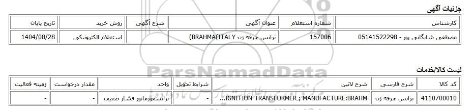تلفن:5- 88349670 (021) فکس: 88349673 (021) Website: www.ParsNamadData.com E-mail: Info@ParsNamadData.com استعلام الکترونیکی ترانس جرقه زن BRAHMA(ITALY)