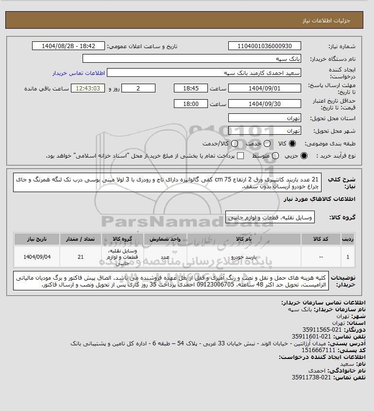 تلفن:5- 88349670 (021) فکس: 88349673 (021) Website: www.ParsNamadData.com E-mail: Info@ParsNamadData.com استعلام 21 عدد باربند کانتینری ورق 2 ارتفاع 75 cm کفی گالوانیزه دارای تاج و رودری با 3 لولا مینی بوسی درب تک لنگه همرنگ و