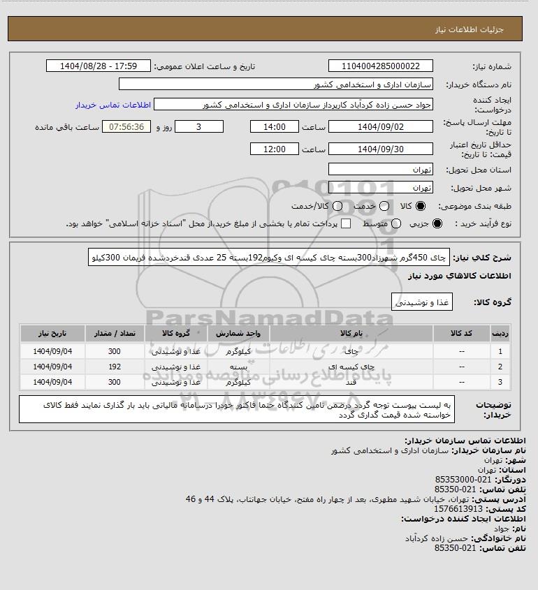 تلفن:5- 88349670 (021) فکس: 88349673 (021) Website: www.ParsNamadData.com E-mail: Info@ParsNamadData.com استعلام چای 450گرم شهرزاد300بسته چای کیسه ای وکیوم192بسته 25 عددی قندخردشده فریمان 300کیلو