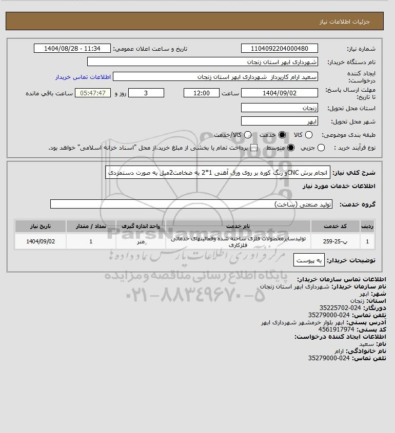 تلفن:5- 88349670 (021) فکس: 88349673 (021) Website: www.ParsNamadData.com E-mail: Info@ParsNamadData.com استعلام انجام برش CNCو رنگ کوره بر روی ورق آهنی 1*2 به ضخامت2میل به صورت دستمزدی