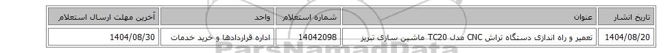 تلفن:5- 88349670 (021) فکس: 88349673 (021) Website: www.ParsNamadData.com E-mail: Info@ParsNamadData.com استعلام تعمیر و راه اندازی دستگاه تراش CNC مدل TC20 ماشین سازی تبریز