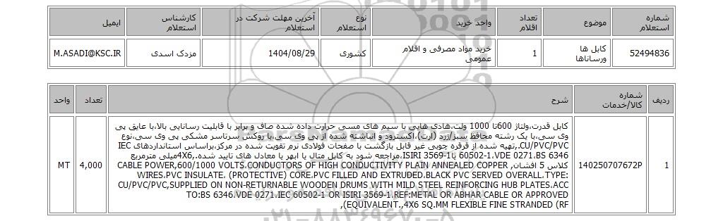 | ردیف | شماره کالا/خدمات | شرح | تعداد | واحد | | 1 | 140250707672P | کابل قدرت،ولتاژ 600تا 1000 ولت،هادی هایی با سیم های مسی حرارت داده شده صاف و برابر با قابلیت رسانایی بالا،با عایق پی وی سی،با یک رشته محافظ سبز/زرد (ارت)،اکسترود و انباشته شده از پی وی سی،با روکش سرتاسر مشکی پی وی سی،نوع CU/PVC/PVC.,تهیه شده از قرقره چوبی غیر قابل بازگشت با صفحات فولادی نرم تقویت شده در مرکز،براساس استانداردهای IEC 60502-1،VDE 0271،BS 6346 یاISIRI 3569-1،مراجعه شود به کابل متال یا ابهر یا معادل های تایید شده.,4X6میلی مترمربع کلاس 5 افشان,