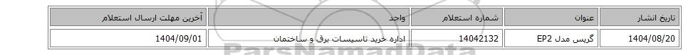 تلفن:5- 88349670 (021) فکس: 88349673 (021) Website: www.ParsNamadData.com E-mail: Info@ParsNamadData.com استعلام گریس مدل EP2
