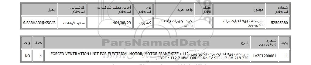 تلفن:5- 88349670 (021) فکس: 88349673 (021) Website: www.ParsNamadData.com E-mail: Info@ParsNamadData.com استعلام سیستم تهویه اجباری برای الکتروموتور