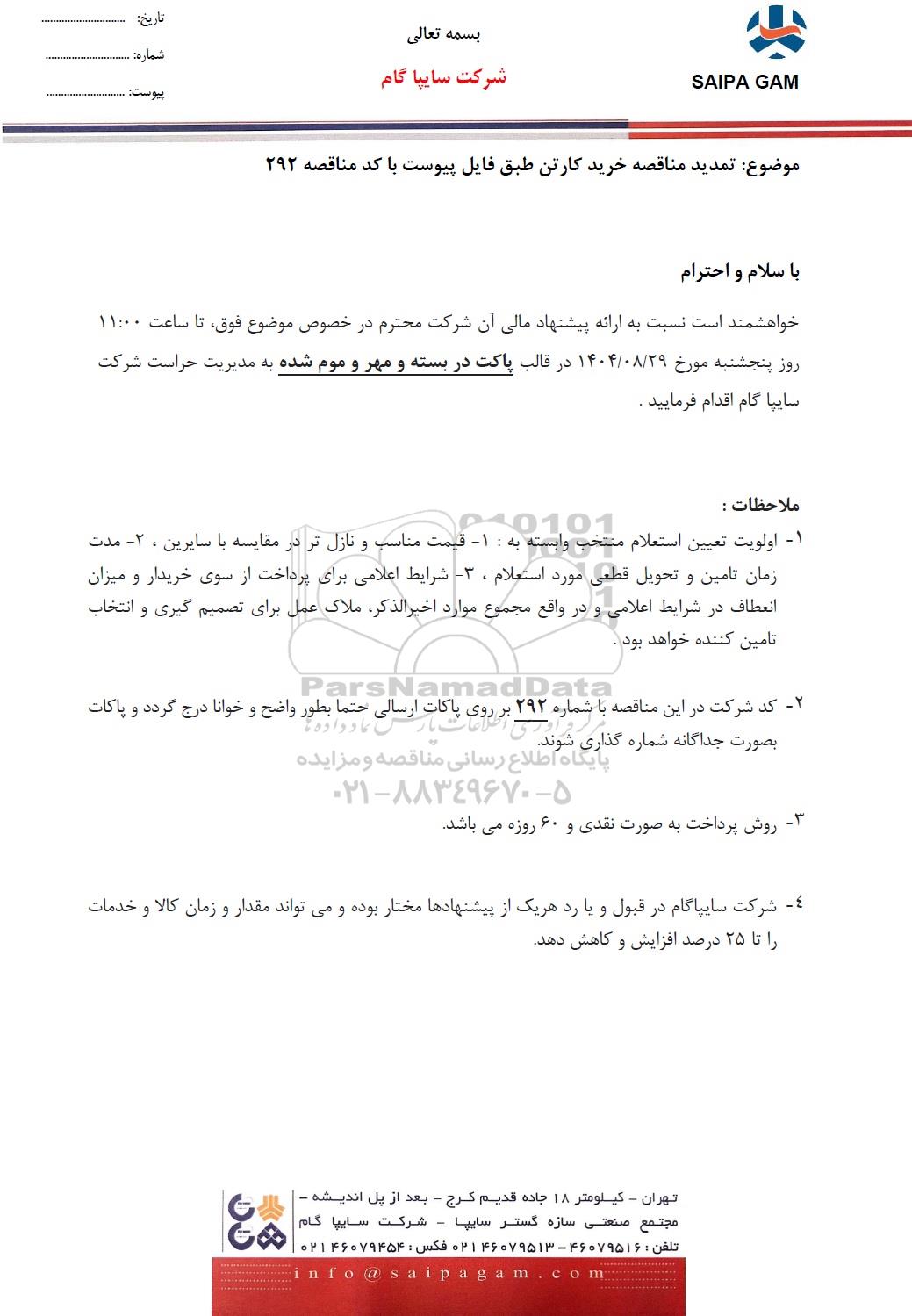 موضوع: تمدید مناقصه خرید کارتن طبق فایل پیوست با کد مناقصه 292