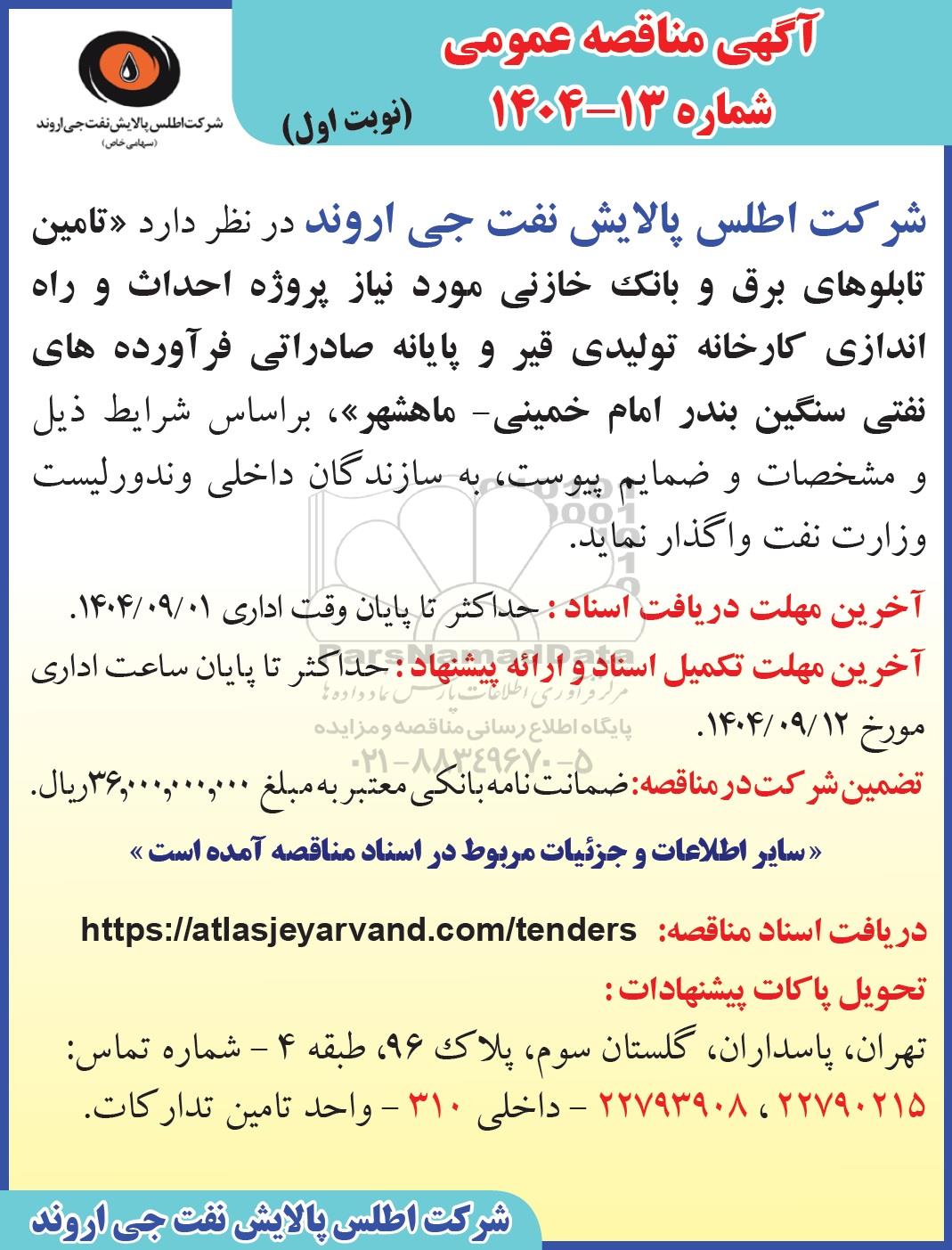 تلفن:5- 88349670 (021) فکس: 88349673 (021) Website: www.ParsNamadData.com E-mail: Info@ParsNamadData.com مناقصه عمومی تامین تابلوهای برق و بانک خازنی مورد نیاز پروژه احداث و راه اندازی کارخانه تولیدی قیر و پایانه صادراتی...