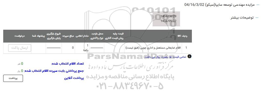 تلفن:5- 88349670 (021) فکس: 88349673 (021) Website: www.ParsNamadData.com E-mail: Info@ParsNamadData.com مزایده اقلام ضایعاتی مستعمل و اداری چوبی