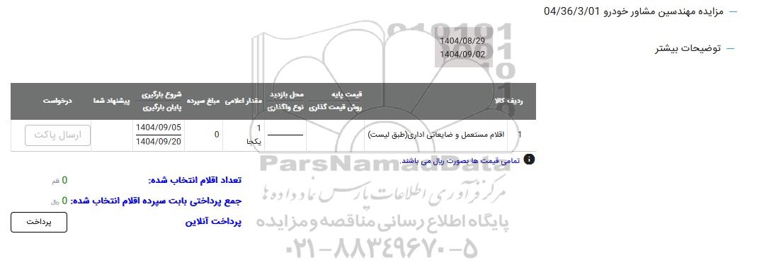 تلفن:5- 88349670 (021) فکس: 88349673 (021) Website: www.ParsNamadData.com E-mail: Info@ParsNamadData.com مزایده اقلام مستعمل و ضایعاتی اداری طبق لیست