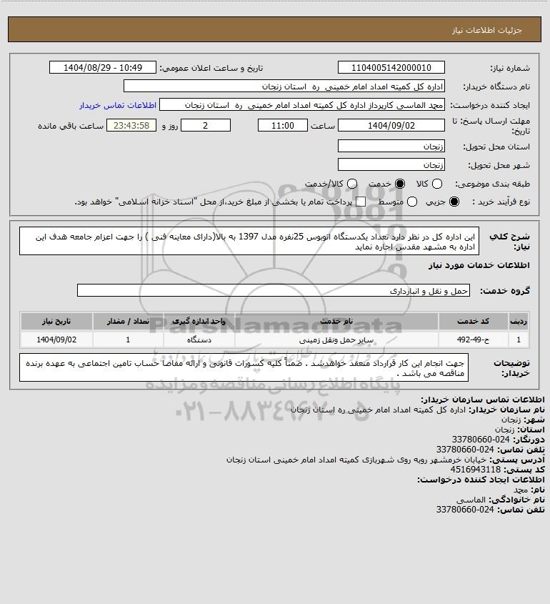 تلفن:5- 88349670 (021) فکس: 88349673 (021) Website: www.ParsNamadData.com E-mail: Info@ParsNamadData.com استعلام این اداره کل در نظر دارد تعداد یکدستگاه اتوبوس 25نفره مدل 1397 به بالا(دارای معاینه فنی ) را جهت اعزام جامعه هدف این اداره به مشهد مقدس اجاره نماید