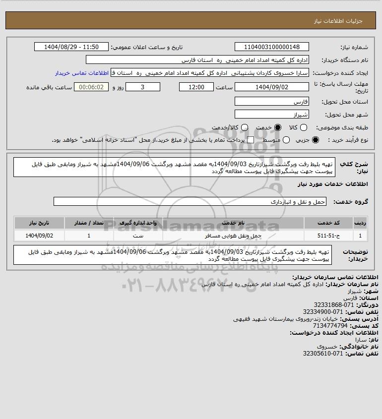 تلفن:5- 88349670 (021) فکس: 88349673 (021) Website: www.ParsNamadData.com E-mail: Info@ParsNamadData.com استعلام تهیه بلیط رفت وبرگشت شیرازتاریخ 1404/09/03به مقصد مشهد وبرگشت 1404/09/06مشهد به شیراز ومابقی طبق فایل پیوست جهت پیشگیری فایل پیوست مطالعه گردد