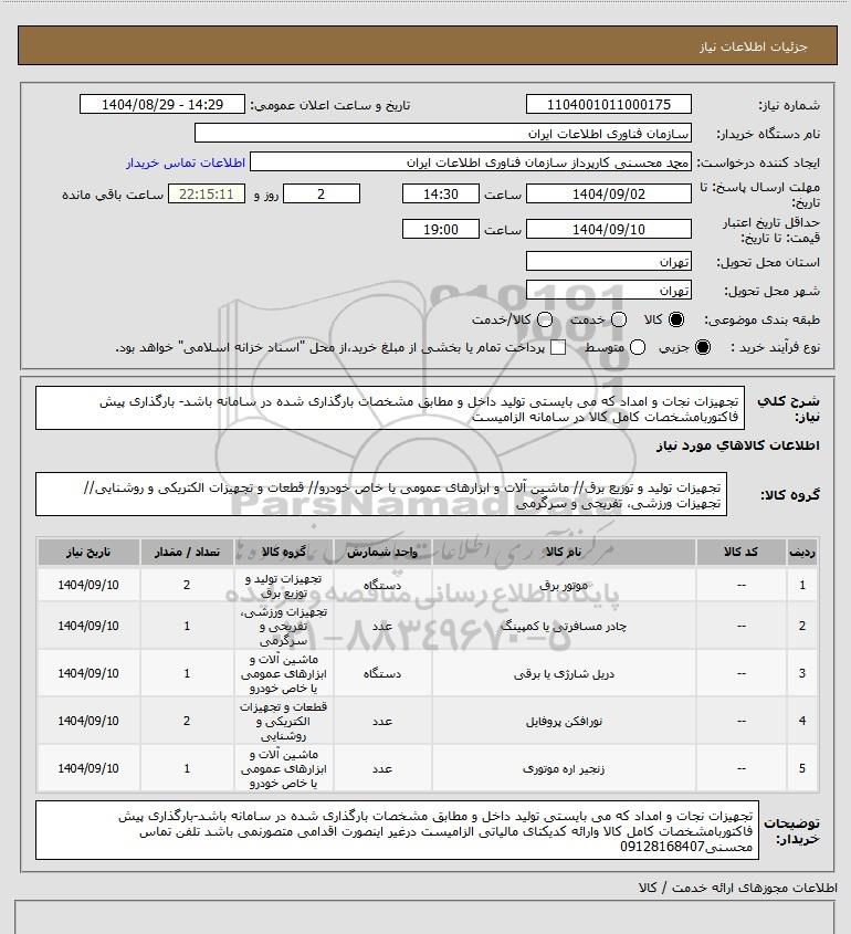 تلفن:5- 88349670 (021) فکس: 88349673 (021) Website: www.ParsNamadData.com E-mail: Info@ParsNamadData.com استعلام تجهیزات نجات و امداد که می بایستی تولید داخل و مطابق مشخصات بارگذاری شده در سامانه باشد- بارگذاری پیش فاکتوربامشخصات کامل کالا در سامانه الزامیست