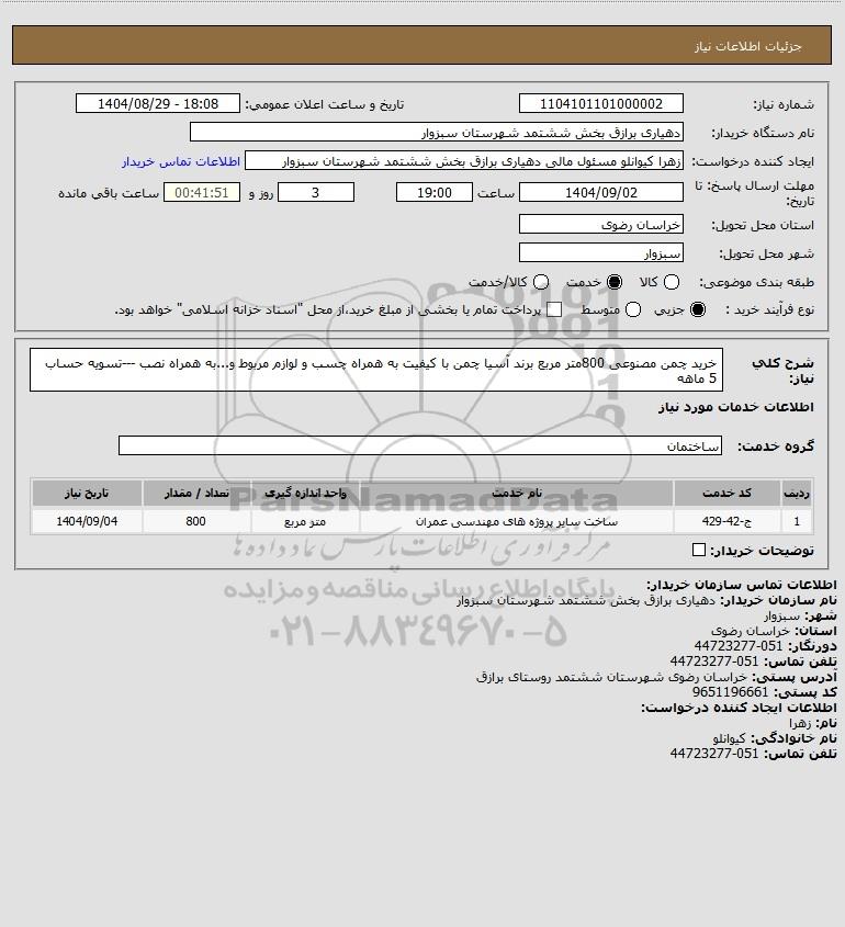 تلفن:5- 88349670 (021) فکس: 88349673 (021) Website: www.ParsNamadData.com E-mail: Info@ParsNamadData.com استعلام خرید چمن مصنوعی 800متر مربع برند آسیا چمن با کیفیت به همراه چسب و لوازم مربوط و...به همراه نصب ---تسویه حساب 5 ماهه
