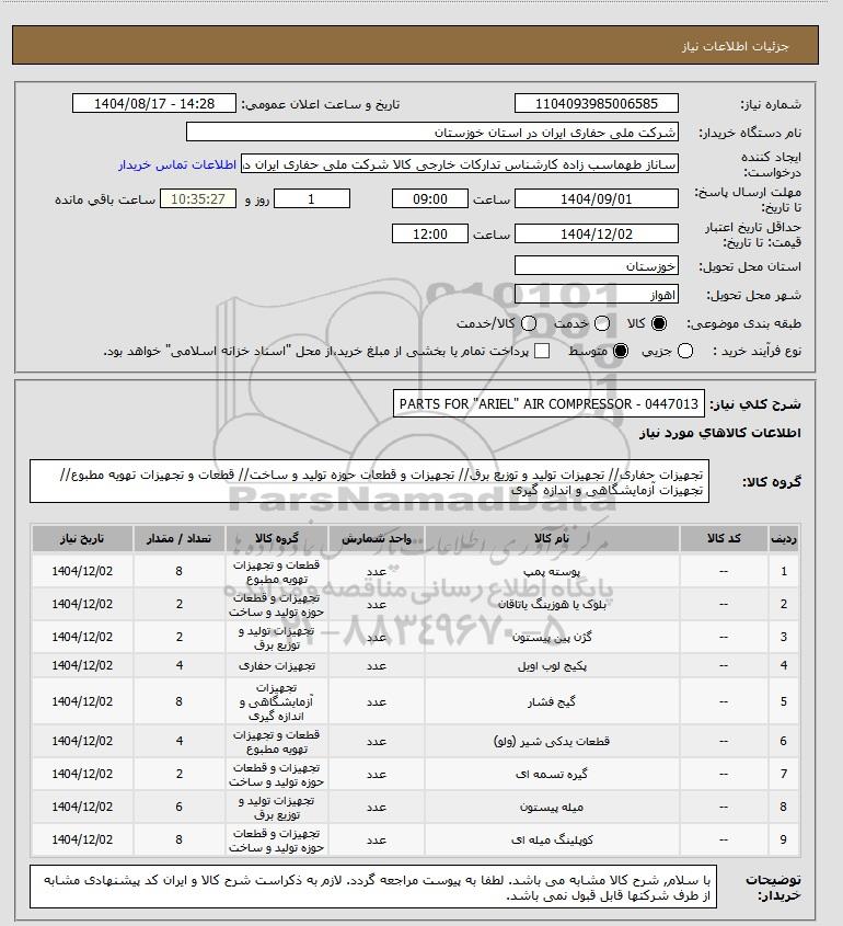 تلفن:5- 88349670 (021) فکس: 88349673 (021) Website: www.ParsNamadData.com E-mail: Info@ParsNamadData.com استعلام PARTS FOR "ARIEL" AIR COMPRESSOR - 0447013
