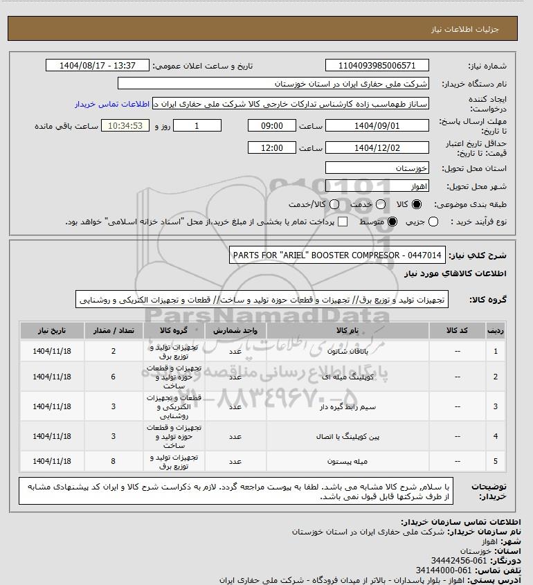 تلفن:5- 88349670 (021) فکس: 88349673 (021) Website: www.ParsNamadData.com E-mail: Info@ParsNamadData.com استعلام PARTS FOR "ARIEL" BOOSTER COMPRESOR - 0447014