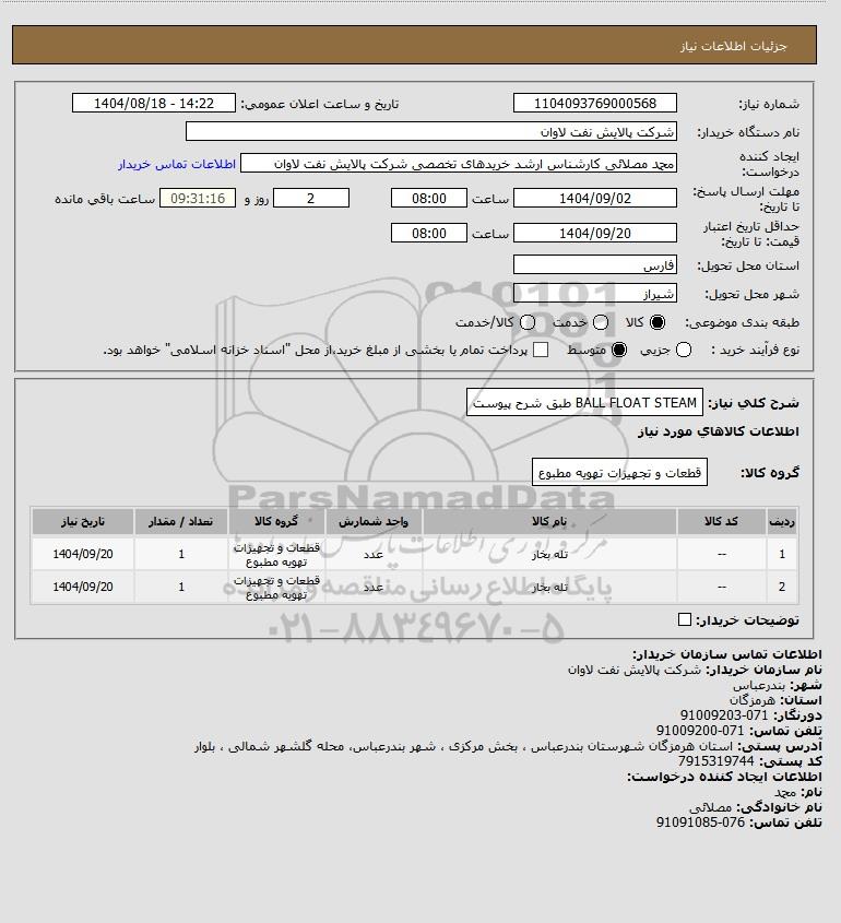 تلفن:5- 88349670 (021) فکس: 88349673 (021) Website: www.ParsNamadData.com E-mail: Info@ParsNamadData.com استعلام BALL FLOAT STEAM طبق شرح پیوست، سایت ستاد- استعلام روز شنبه یکم آذر ماه 1404