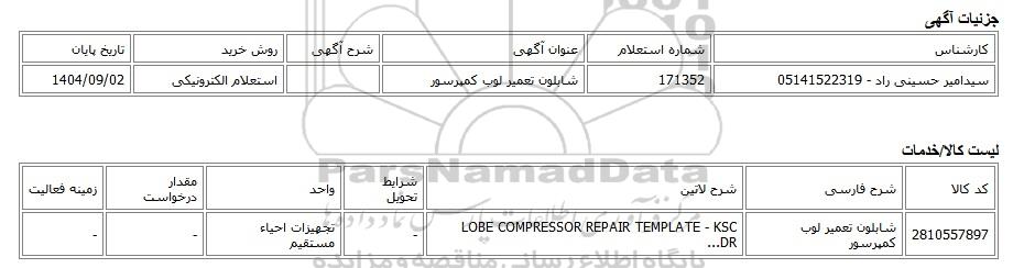تلفن:5- 88349670 (021) فکس: 88349673 (021) Website: www.ParsNamadData.com E-mail: Info@ParsNamadData.com استعلام الکترونیکی شابلون تعمیر لوب کمپرسور