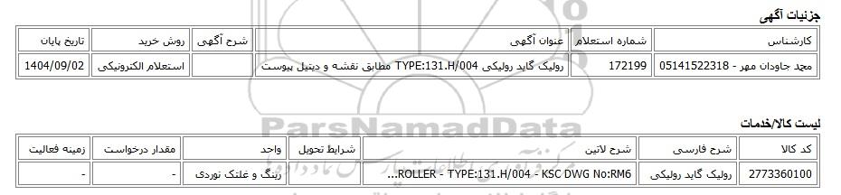 تلفن:5- 88349670 (021) فکس: 88349673 (021) Website: www.ParsNamadData.com E-mail: Info@ParsNamadData.com استعلام الکترونیکی رولیک گاید رولیکی TYPE:131.H/004 مطابق نقشه و دیتیل پیوست