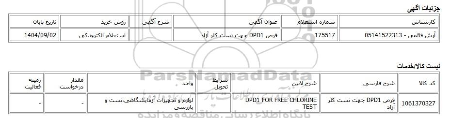 تلفن:5- 88349670 (021) فکس: 88349673 (021) Website: www.ParsNamadData.com E-mail: Info@ParsNamadData.com استعلام الکترونیکی قرص DPD1 جهت تست کلر آزاد