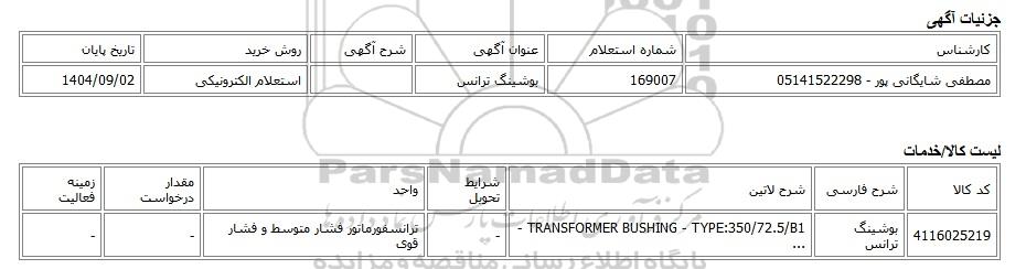 تلفن:5- 88349670 (021) فکس: 88349673 (021) Website: www.ParsNamadData.com E-mail: Info@ParsNamadData.com استعلام الکترونیکی بوشینگ ترانس