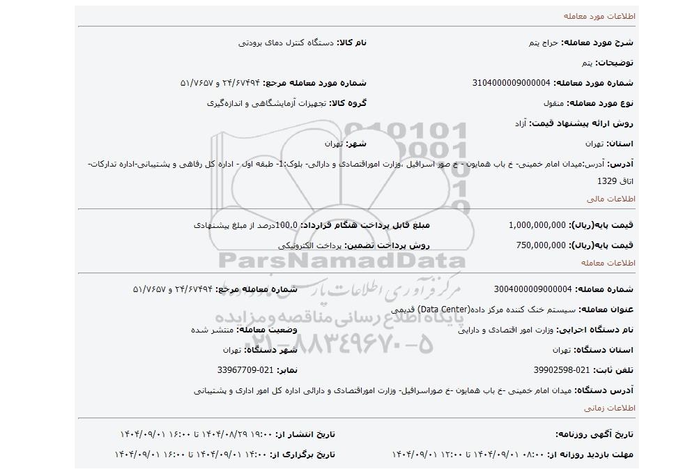 | شرح مورد معامله: حراج یتم | | نام کالا: دستگاه کنترل دمای برودتی | | توضیحات: یتم | | شماره مورد معامله: 3104000009000004 | | شماره مورد معامله مرجع: ۲۴/۶۷۴۹۴ و ۵۱/۷۶۵۷ | | نوع مورد معامله: منقول | | گروه کالا: تجهیزات آزمایشگاهی و اندازه گیری | | روش ارائه پیشنهاد قیمت: آزاد