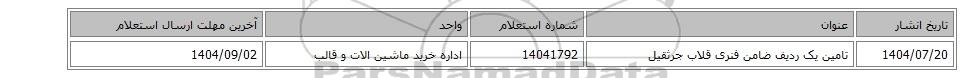 تلفن:5- 88349670 (021) فکس: 88349673 (021) Website: www.ParsNamadData.com E-mail: Info@ParsNamadData.com استعلام تامین یک ردیف ضامن فنری قلاب جرثقیل
