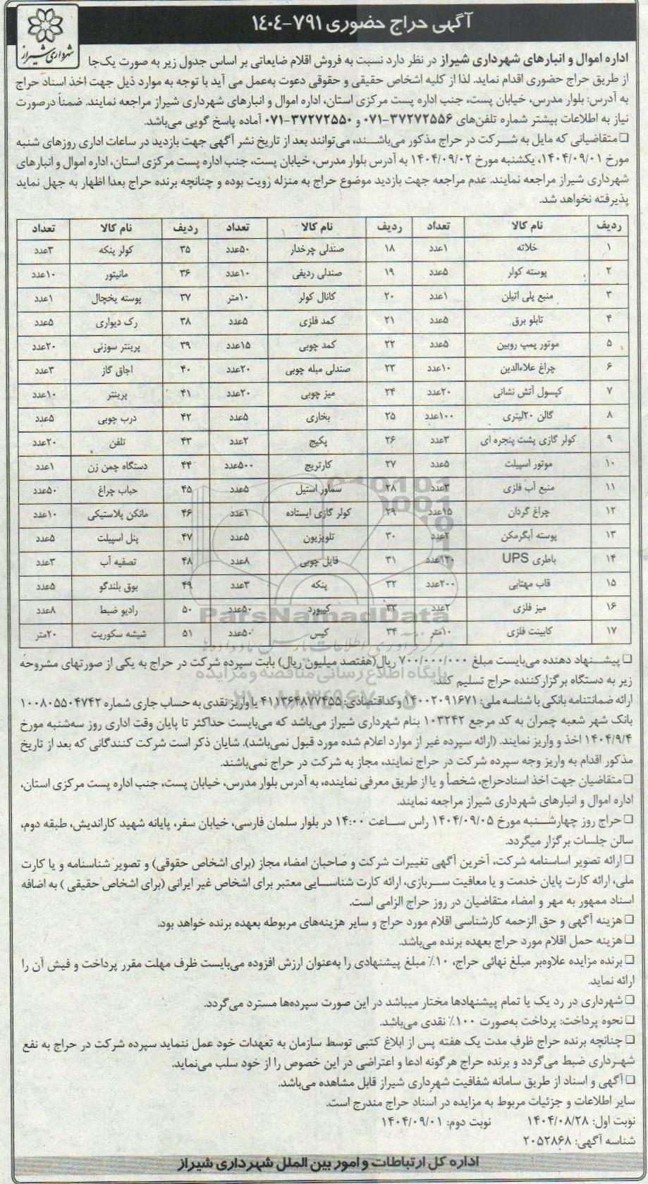 اداره اموال و انبارهای شهرداری شیراز در نظر دارد نسبت به فروش اقلام ضایعاتی بر اساس جدول زیر به صورت یکجا از طریق حراج حضوری اقدام نماید. لذا از کلیه اشخاص حقیقی و حقوقی دعوت بعمل می آید با توجه به موارد ذیل جهت اخذ اسناد حراج به آدرس بلوار مدرس ، خیابان پست ، جنب اداره پست مرکزی استان، اداره اموال و انبارهای شهرداری شیراز مراجعه نمایند. ضمنا در صورت نیاز به اطلاعات بیشتر شماره تلفنهای 37272556 -071 و 37272550 -071 آماده پاسخ گویی میباشد.