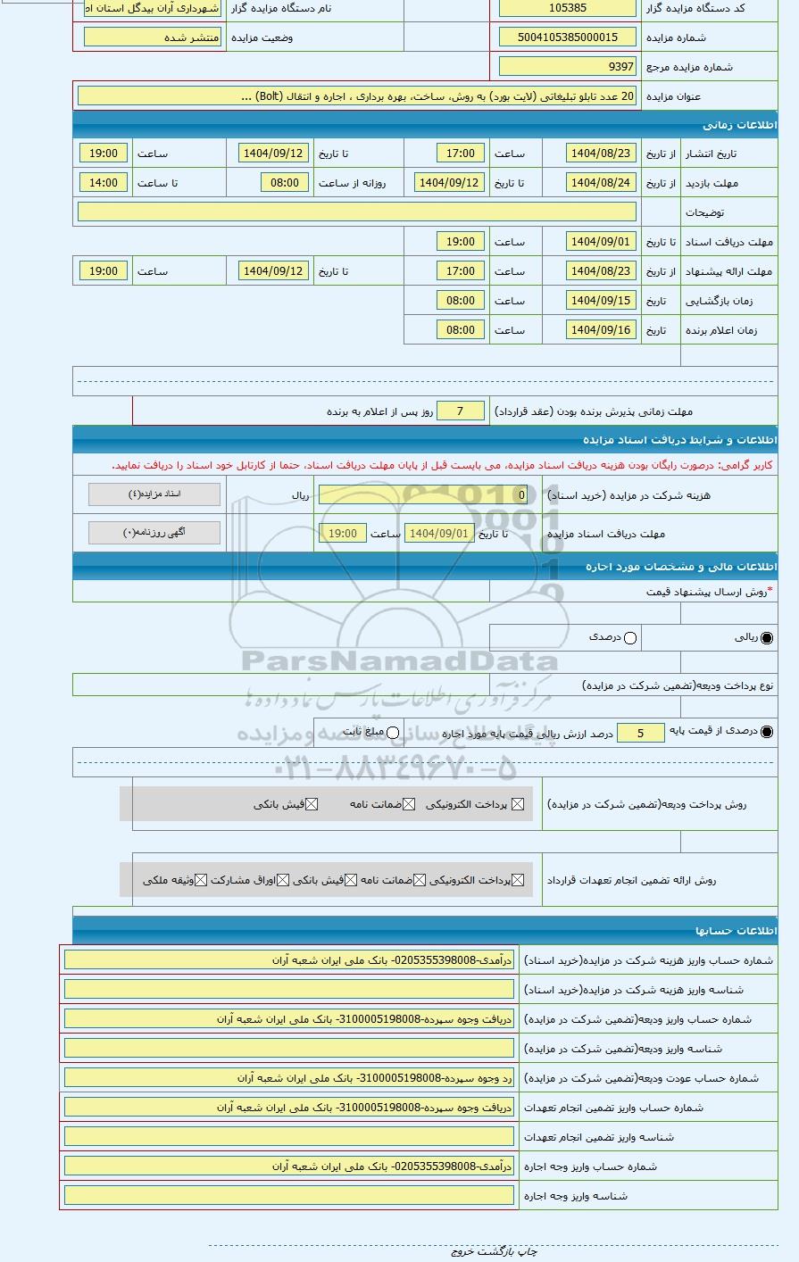 اطلاعات حسابها| شماره حساب واریز هزینه شرکت در مزایده | درآمدی-0205355398008- بانک ملی ایران شعبه آران | | شناسه واریز هزینه شرکت در مزایده | | | شماره حساب واریز ودیعه | دریافت وجوه سپرده-3100005198008- بانک ملی ایران شعبه آران | | شناسه واریز ودیعه | | | شماره حساب عودت ودیعه | رد وجوه سپرده-3100005198008- بانک ملی ایران شعبه آران | | شماره حساب واریز وجه مزایده | دریافت وجوه سپرده-3100005198008- بانک ملی ایران شعبه آران | | شناسه واریز وجه مزایده | | | شماره حساب عودت وجه مزایده | درآمدی-0205355398008- بانک ملی ایران شعبه آران | | شماره حساب عودت وجه مزایده | |