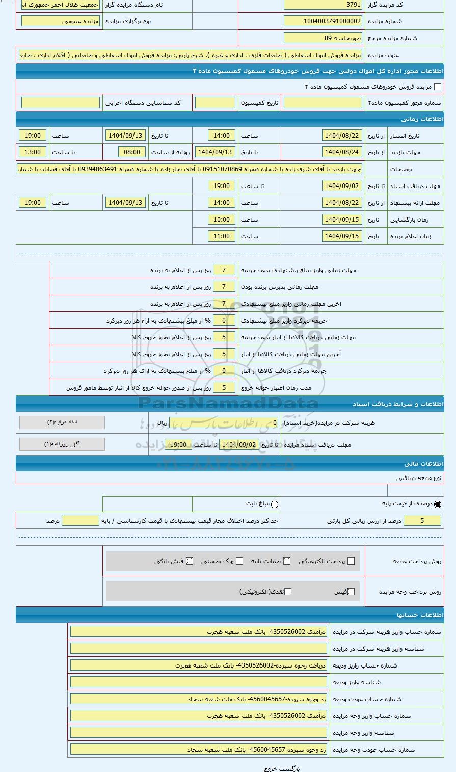 تلفن:5- 88349670 (021) فکس: 88349673 (021) Website: www.ParsNamadData.com E-mail: Info@ParsNamadData.com مزایده مزایده فروش اموال اسقاطی و ضایعاتی ( اقلام اداری ضایعات آهنی و چدنی آلومینیوم و غیره )