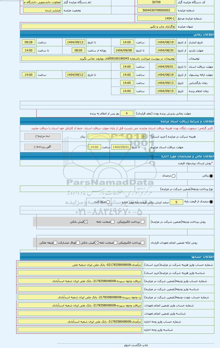 | عنوان آگهی: مزایده واگذاری چاپ و تکثیر |