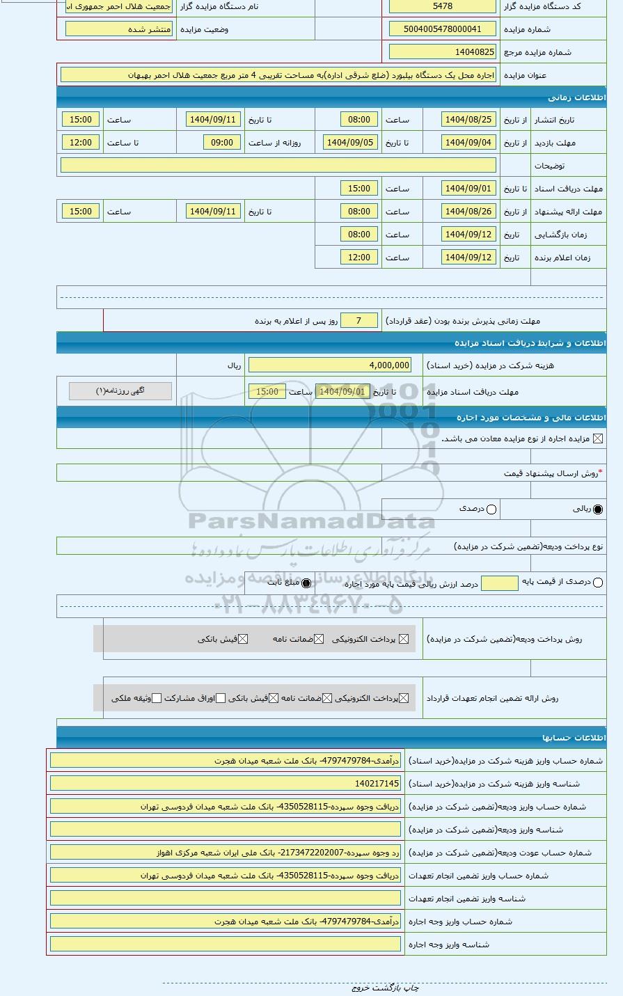 جزئیات آگهی| کد مزایده گزار | 5478 | | نام دستگاه مزایده گزار | جمعیت هلال احمر جمهوری اسلامی ایران استان خوزستان | | شماره مزایده | 5004005478000041 | | | | | شماره مورد اجاره | 5104005478000040 | | نوع برگزاری مزایده |