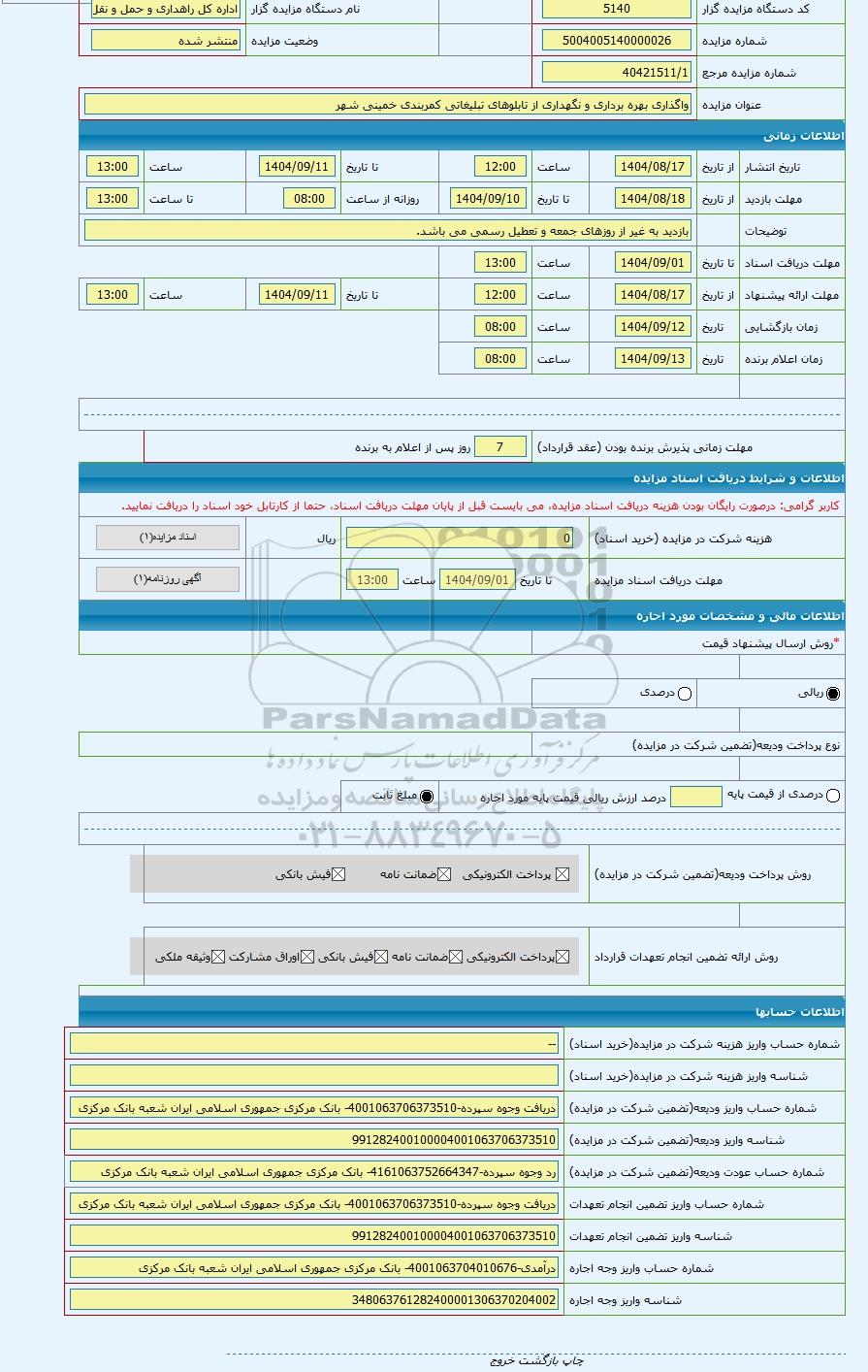 تلفن:5- 88349670 (021) فکس: 88349673 (021) Website: www.ParsNamadData.com E-mail: Info@ParsNamadData.com مزایده واگذاری بهره برداری و نگهداری از تابلوهای تبلیغاتی کمربندی خمینی شهر