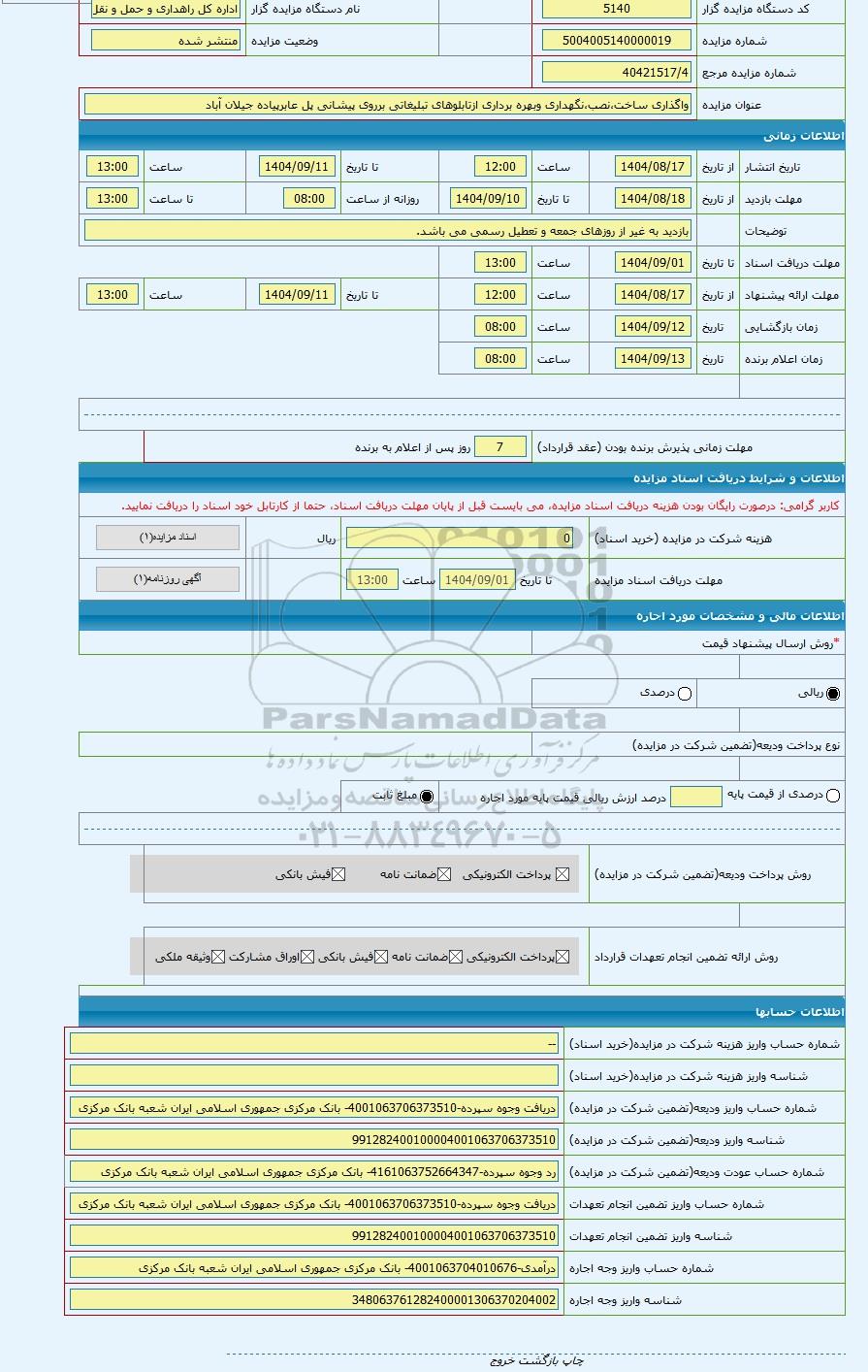 تلفن:5- 88349670 (021) فکس: 88349673 (021) Website: www.ParsNamadData.com E-mail: Info@ParsNamadData.com مزایده واگذاری ساختنصبنگهداری وبهره برداری ازتابلوهای تبلیغاتی برروی پیشانی پل عابرپیاده جیلان آباد