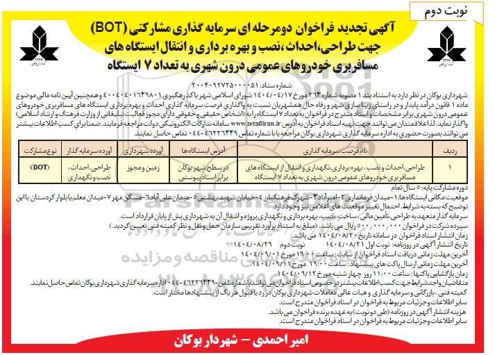 آگهی تجدید فراخوان دومرحله ای سرمایه گذاری مشارکتی (BOT) جهت طراحی، احداث ، نصب و بهره برداری و انتقال ایستگاه های مسافربری خودروهای عمومی درون شهری به تعداد 7 ایستگاه