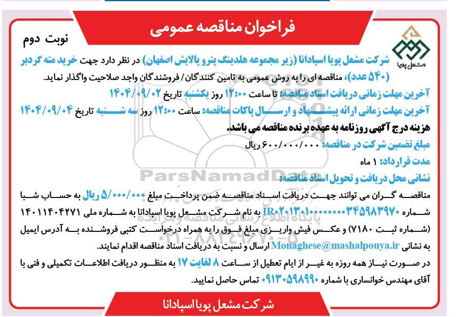 شرکت مشعل پویا اسپادانا (زیر مجموعه هلدینگ پترو پالایش اصفهان) در نظر دارد جهت خرید مته گردبر (540 عدد)، مناقصه ای را به روش عمومی به تامین کنندگان / فروشندگان واجد صلاحیت واگذار نماید.