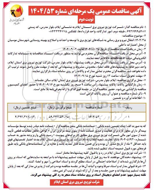 1404/.35: انتقال نیرو و برق رسانی به شبکه های توزیع برق با توسعه و احداث و اصلاح و بهینه روستایی شهرستان موسیان از محل اعتبارات داخلی