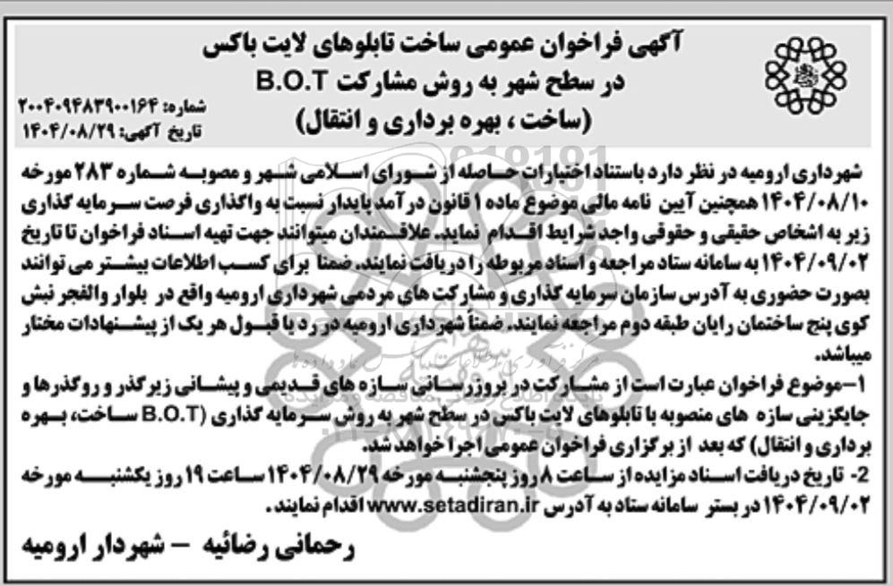 آگهی فراخوان عمومی ساخت تابلوهای لایت باکس در سطح شهر به روش مشارکت B.O.T