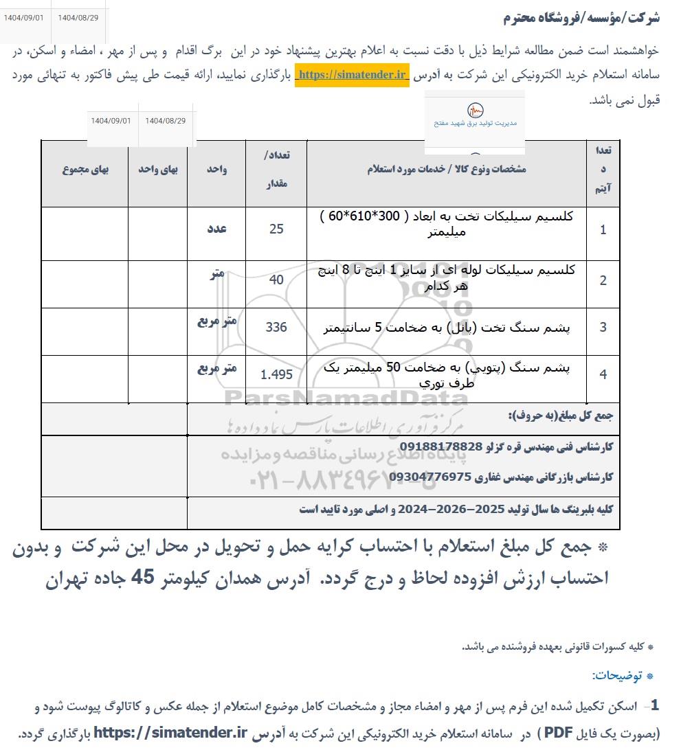 خواهشمند است ضمن مطالعه شرایط ذیل با دقت نسبت به اعلام بهترین پیشنهاد خود در این برگ اقدام و پس از مهر ، امضاء و اسکن در سامانه استعلام خرید الکترونیکی این شرکت به آدرس https://simatender.ir بارگذاری نمایید ارائه قیمت طی پیش فاکتور به تنهایی مورد قبول نمی باشد.