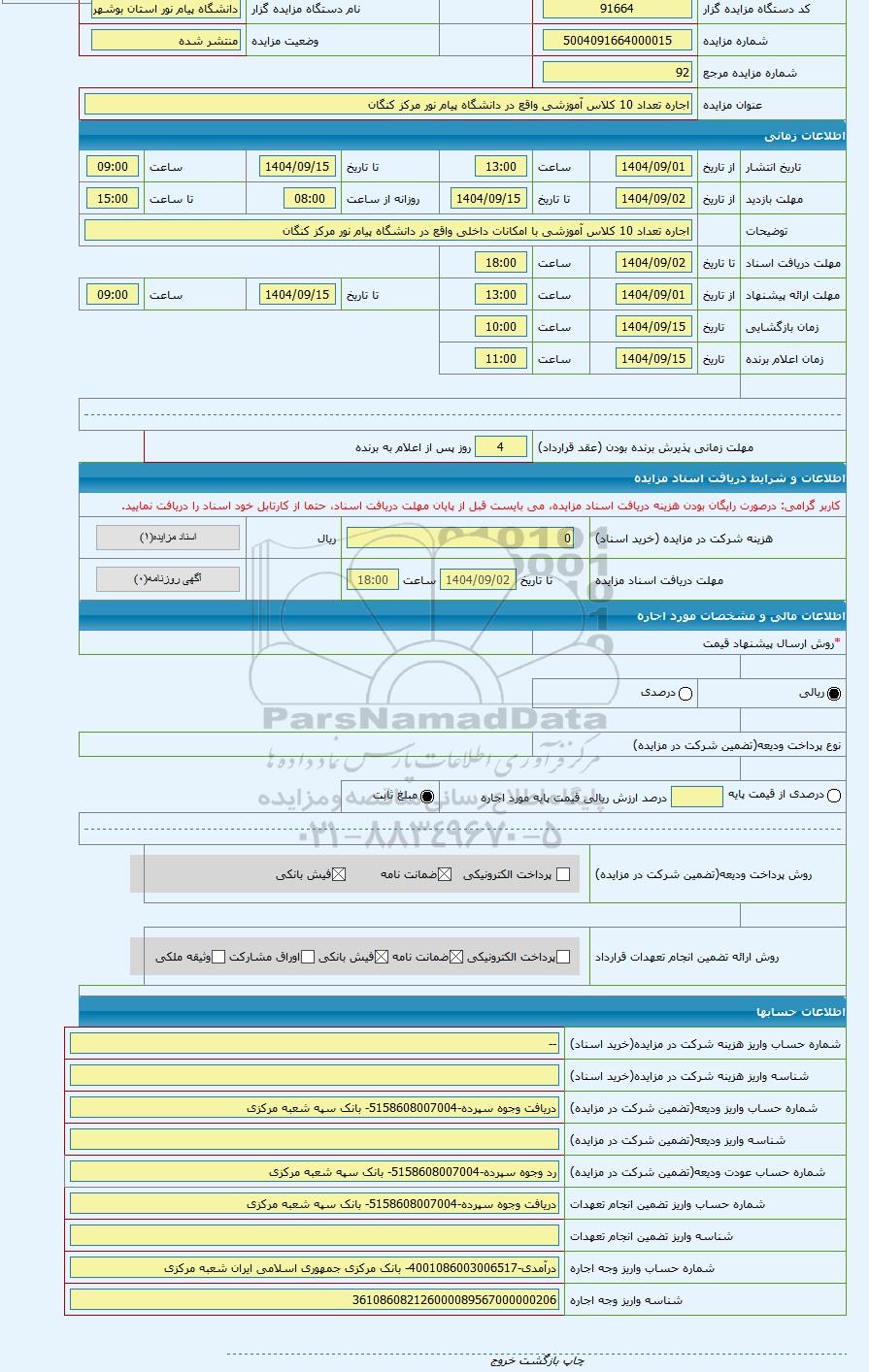 | عنوان آگهی: مزایده اجاره تعداد 10 کلاس آموزشی واقع در دانشگاه پیام نور مرکز کنگان |