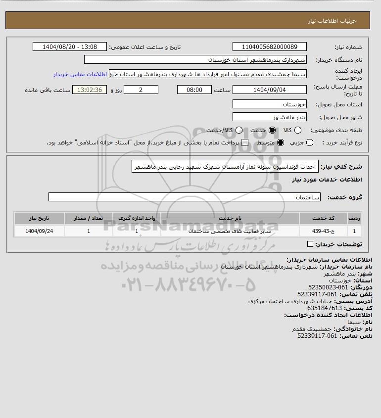 تلفن:5- 88349670 (021) فکس: 88349673 (021) Website: www.ParsNamadData.com E-mail: Info@ParsNamadData.com استعلام احداث فونداسیون سوله نماز آرامستان شهرک شهید رجایی بندر ماهشهر، سایت ستاد- استعلام روز یکشنبه دوم آذر ماه 1404