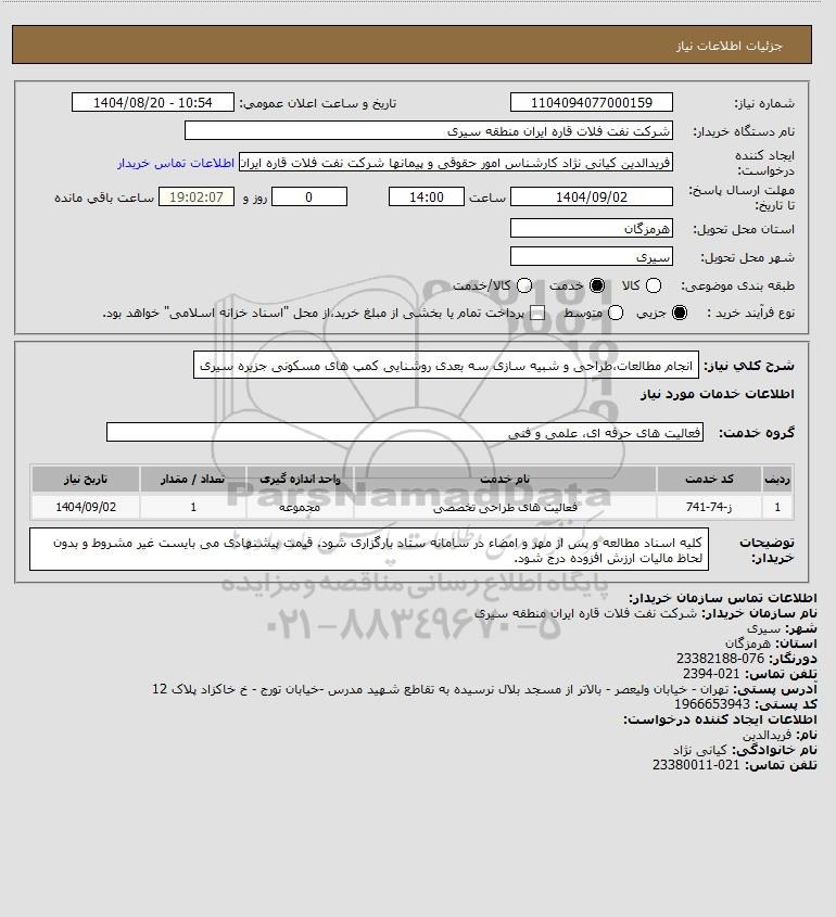 تلفن:5- 88349670 (021) فکس: 88349673 (021) Website: www.ParsNamadData.com E-mail: Info@ParsNamadData.com استعلام انجام مطالعاتطراحی و شبیه سازی سه بعدی روشنایی کمپ های مسکونی جزیره سیری