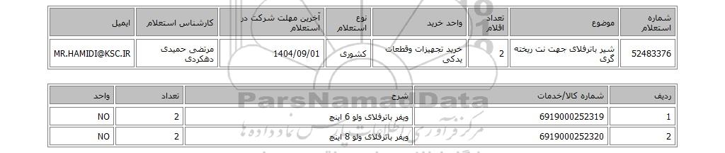 تلفن:5- 88349670 (021) فکس: 88349673 (021) Website: www.ParsNamadData.com E-mail: Info@ParsNamadData.com استعلام شیر باترفلای جهت نت ریخته گری