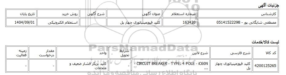 تلفن:5- 88349670 (021) فکس: 88349673 (021) Website: www.ParsNamadData.com E-mail: Info@ParsNamadData.com استعلام الکترونیکی کلید فیوزمینیاتوری چهار پل