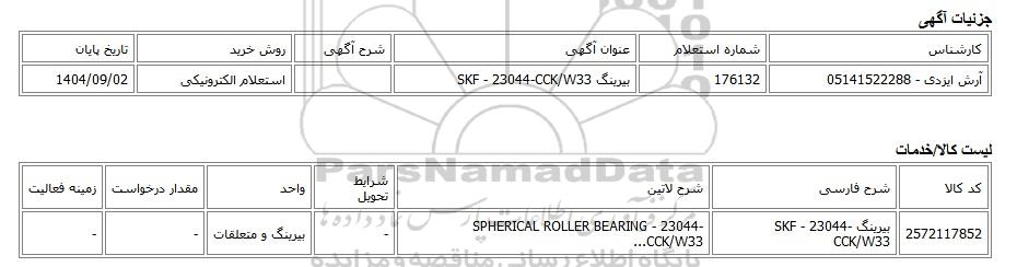تلفن:5- 88349670 (021) فکس: 88349673 (021) Website: www.ParsNamadData.com E-mail: Info@ParsNamadData.com استعلام الکترونیکی بیرینگ SKF - 23044-CCK/W33