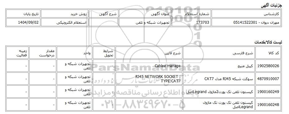 تلفن:5- 88349670 (021) فکس: 88349673 (021) Website: www.ParsNamadData.com E-mail: Info@ParsNamadData.com استعلام الکترونیکی تجهیزات شبکه و تلفن