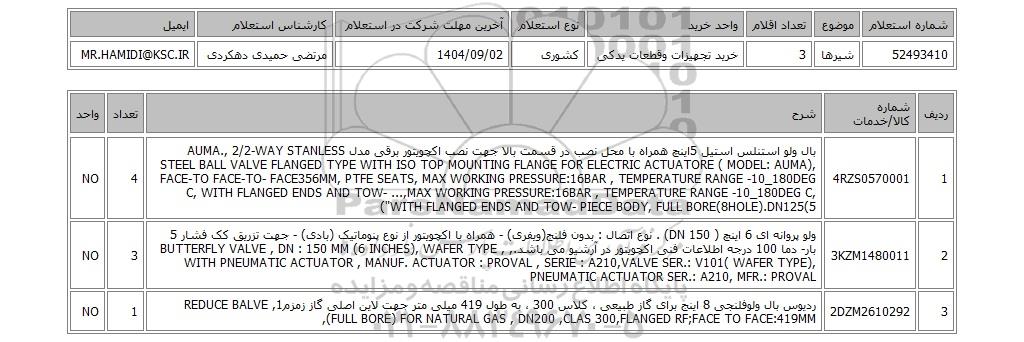 2/2-WAY STANLESS STEEL BALL VALVE FLANGED TYPE WITH ISO TOP MOUNTING FLANGE FOR ELECTRIC ACTUATORE ( MODEL: AUMA), FACE-TO FACE-TO- FACE356MM, PTFE SEATS, MAX WORKING PRESSURE:16BAR , TEMPERATURE RANGE -10_180DEG C, WITH FLANGED ENDS AND TOW- ...,MAX WORKING PRESSURE:16BAR , TEMPERATURE RANGE -10_180DEG C, WITH FLANGED ENDS AND TOW- PIECE BODY, FULL BORE(8HOLE).DN125(5") | 4 | NO | | 2 | 3KZM1480011 | ولو پروانه ای 6 اینچ ( DN 150) . نوع اتصال : بدون فلنج(ویفری) - همراه با اکچویتور از نوع پنوماتیک (بادی) - جهت تزریق کک فشار 5 بار- دما 100 درجه اطلاعات فنی اکچویتور در آرشیو می باشد.,