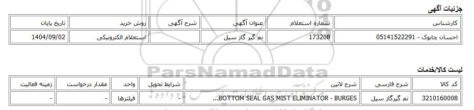 تلفن:5- 88349670 (021) فکس: 88349673 (021) Website: www.ParsNamadData.com E-mail: Info@ParsNamadData.com استعلام الکترونیکی نم گیر گاز سیل