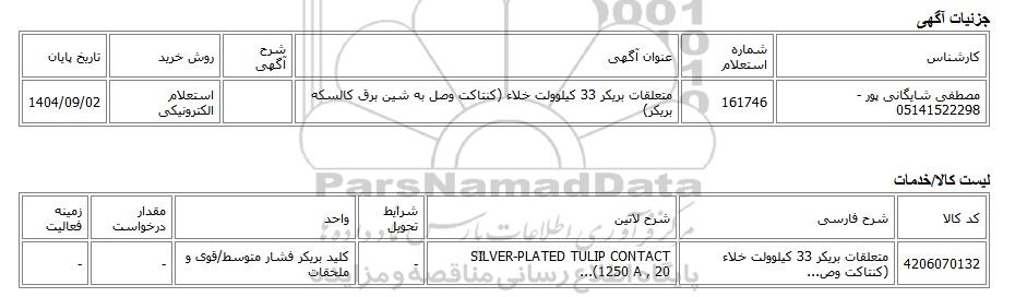 تلفن:5- 88349670 (021) فکس: 88349673 (021) Website: www.ParsNamadData.com E-mail: Info@ParsNamadData.com استعلام الکترونیکی متعلقات بریکر 33 کیلوولت خلاء (کنتاکت وصل به شین برق کالسکه بریکر)