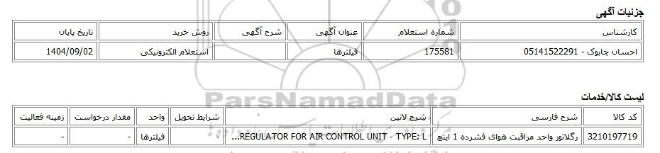 تلفن:5- 88349670 (021) فکس: 88349673 (021) Website: www.ParsNamadData.com E-mail: Info@ParsNamadData.com استعلام الکترونیکی فیلترها