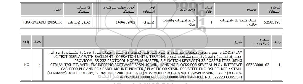 | شماره استعلام | موضوع | تعداد اقلام | واحد خرید | نوع استعلام | آخرین مهلت شرکت در استعلام | کارشناس استعلام | ایمیل | | 52505193 | کنترل کننده ها وتجهیزات جانبی | 1 | خرید تجهیزات وقطعات یدکی | کشوری | 1404/09/02 | توفیق کریم زاده | T.KARIMZADEH@KSC.IR |