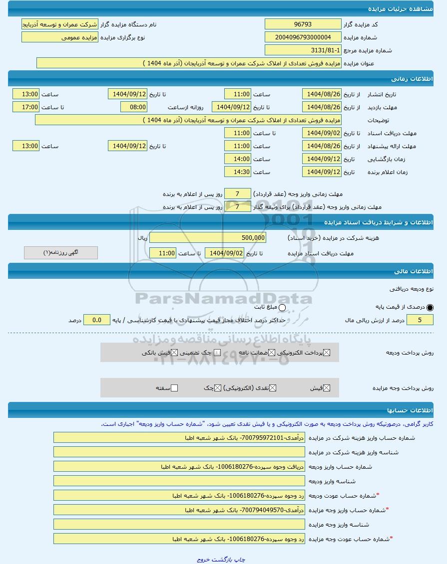 اطلاعات زمانی| تاریخ انتشار از تاریخ | 1404/08/26 | ساعت | 11:00 | تا تاریخ | 1404/09/12 | ساعت | 13:00 | | مهلت بازدید از | 1404/08/26 | تا تاریخ | 1404/09/12 | روزانه از ساعت | 08:00 | تا ساعت | 17:00 | | توضیحات | مزایده فروش تعدادی از املاک شرکت عمران و توسعه آذربایجان (آذر ماه 1404 ) | | مهلت ارائه پیشنهاد از تاریخ | 1404/08/26 | ساعت | 11:00 | تا تاریخ | 1404/09/12 | ساعت | 13:00 | | زمان بازگشایی تاریخ | 1404/09/12 | ساعت | 14:00 | | زمان اعلام برنده تاریخ | 1404/09/12 | ساعت | 14:30 | | مهلت زمانی واریز وجه (عقد قرارداد) 7 روز پس از اعلام به برنده | | مهلت زمانی واریز وجه (عقد قرارداد) برای وثیقه گذار 7 روز پس از اعلام به برنده |